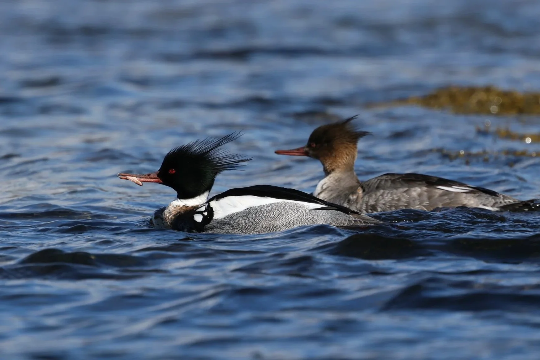 Male and female red breasted mergansers with a catch.